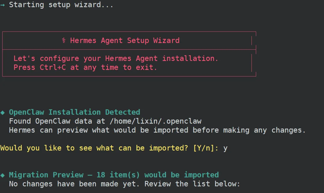 2. 从OpenClaw迁移的朋友,输入hermes claw migrate就能一键导入配置,不用重新设置。