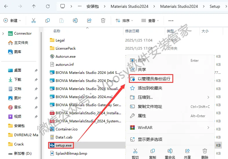 1.解压安装包:鼠标右击【Materials Studio 2024】压缩包,选择电脑上安装的解压软件(如:WinRAR),点击【解压到Materials Studio 2024】。