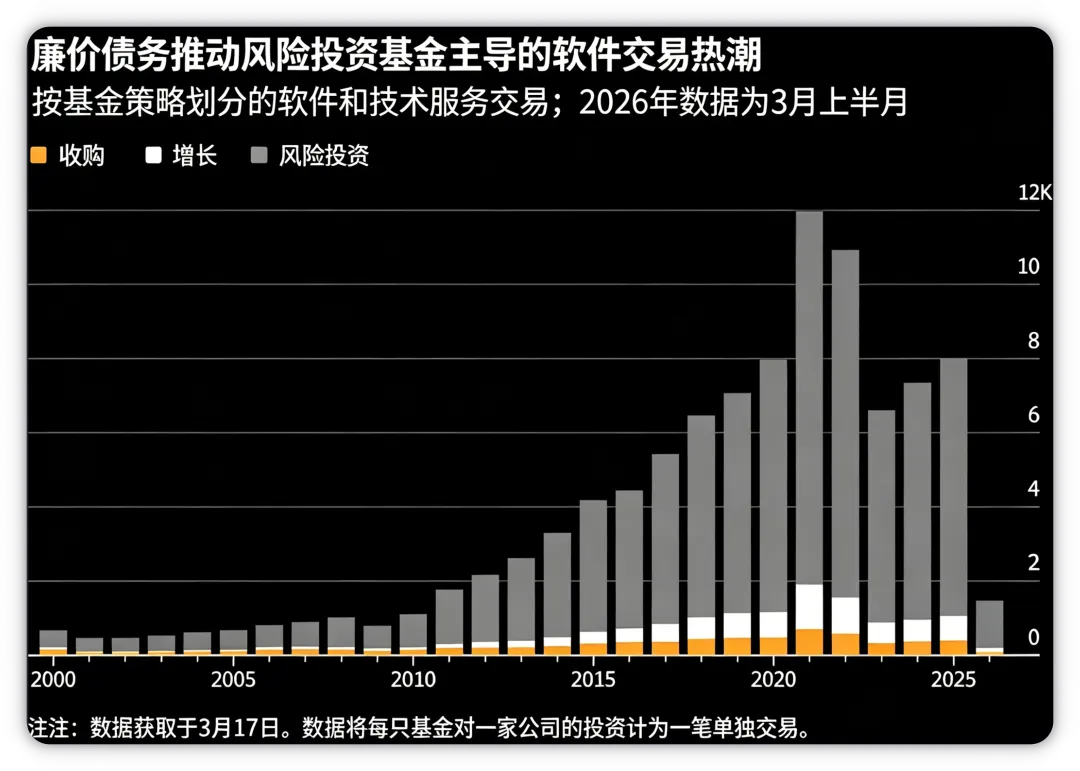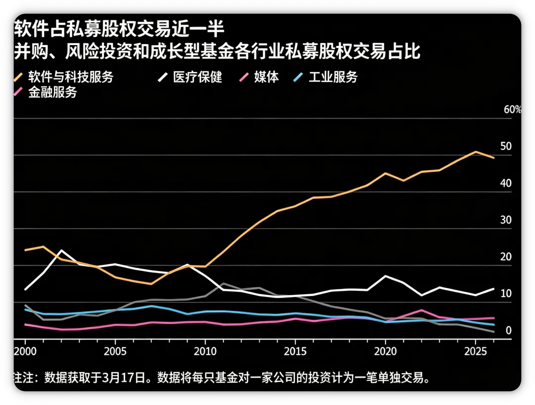 过去十五年,私募市场将数千亿美元配置到软件行业,押注SaaS商业模式能产生高增长和稳定现金流。这种集中度在近年愈发极端:软件和技术服务已占所有私募股权交易的约一半,远超其他任何行业。在低利率时期,这种集中度通过超额的基金回报得到了证明。但随着利率上升、AI颠覆、以及估值回调,曾经的“回报引擎”正在变成“风险敞口”。2021年,PE和风投在软件行业的并购达到创纪录水平,那些以天价成交的收购案,如今因对冲失败、借贷成本飙升而拖累业绩。