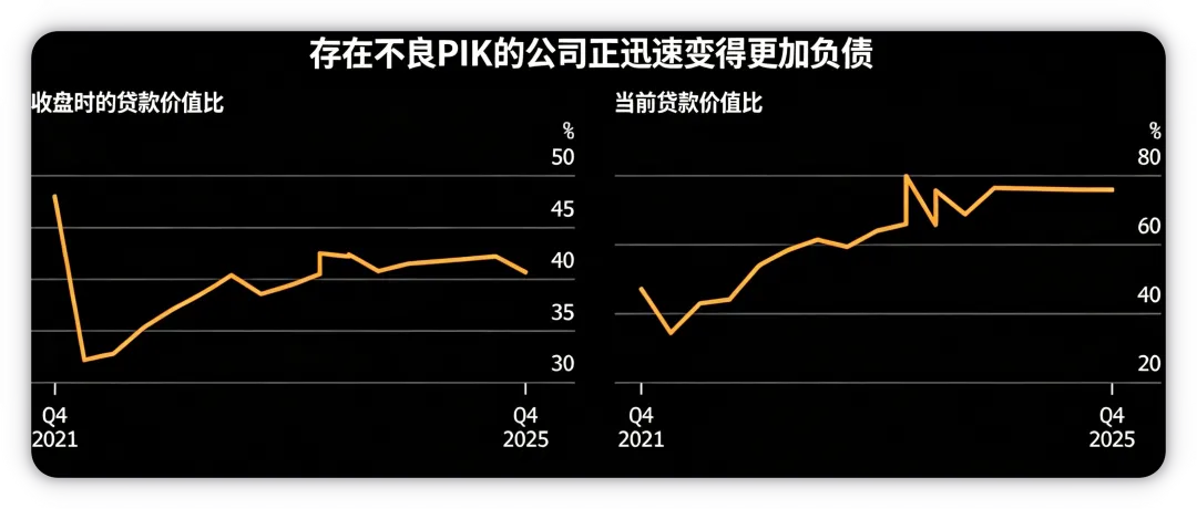 监管机构的一个担忧是,私募信贷公司正在使用“实物支付”(PIK)条款来掩盖投资组合的疲软。“坏PIK”——即在贷款存续期内为缓解现金流压力而增加的利息递延——被林肯国际用作私募信贷违约率的代理指标。数据显示,第四季度约有6.4% 的直接贷款借款人使用了“坏PIK”,远高于2021年底的2.5%。这些借款人的贷款价值比也在飙升,这是另一个压力信号。林肯国际的罗恩·卡恩表示:“直接贷款人和私募股权之间多年来的共生关系正在破裂。”赞助商们表示,如果看不到进一步的价值,就不会继续支持这些公司。