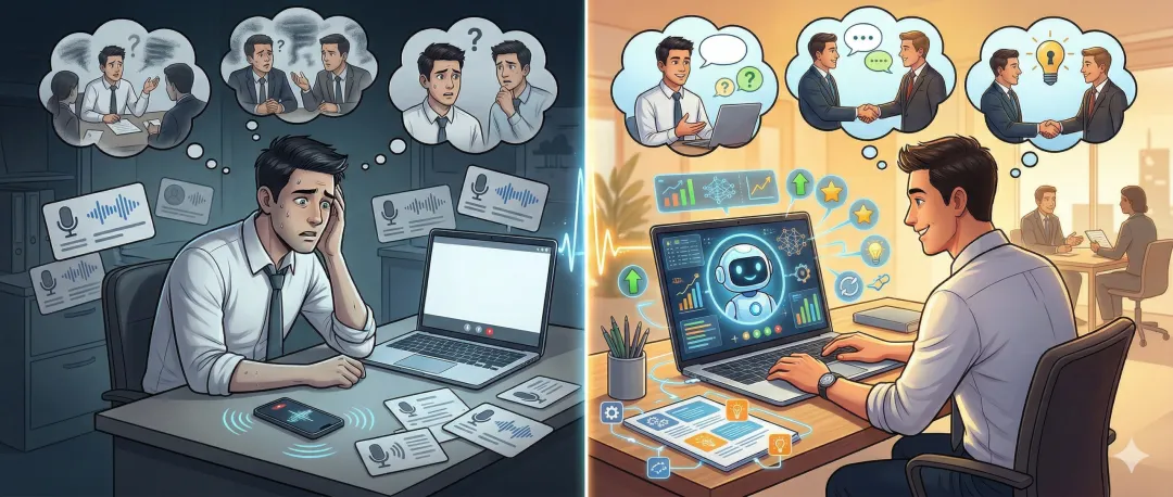 你不再需要从零回忆,而是看着一份已经整理好的对话记录,去标记「这个问题我答得不好」「这里被追问了三层我只扛住了两层」。启动成本直接从「打开空白文档发呆」变成了「浏览一遍 AI 纪要做标注」。