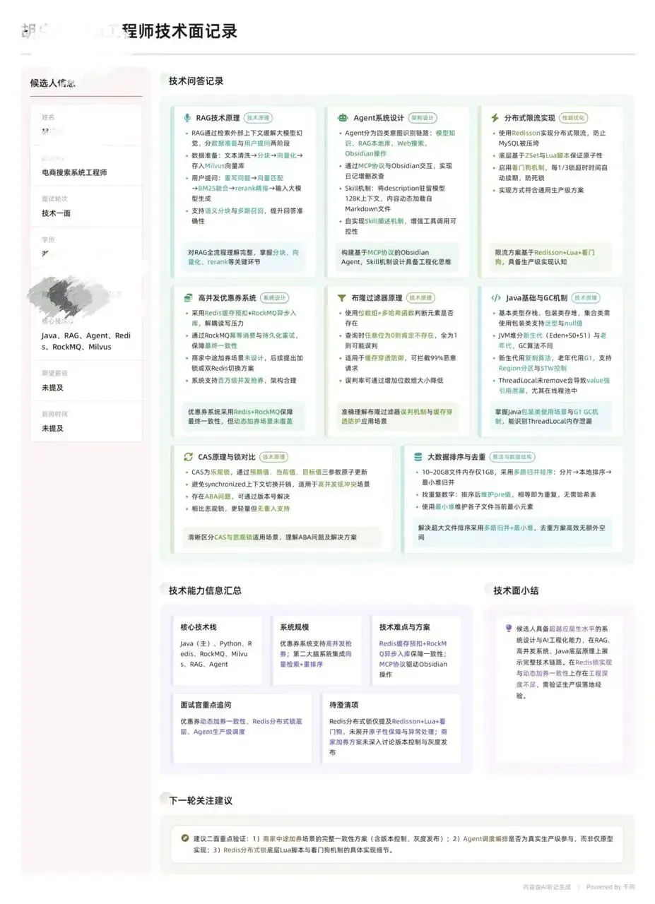 这时候你会发现一个很残酷的事情,面试时那些具体的追问、你卡壳的瞬间、面试官的表情变化,全都模糊了。你只记得一个大概的感觉,「好像聊了八股」「好像项目被追问了」「好像最后反问环节有点尬」。
