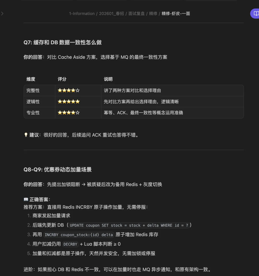 手写面经的问题就在这里,它要求你从零开始回忆。而人的记忆是会骗人的,尤其是高压面试之后,你的大脑会自动过滤掉让你不舒服的部分。恰好那些部分才是最该复盘的。