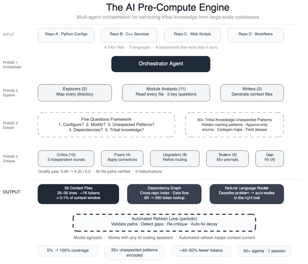 我们通过构建一个预计算引擎来解决这个问题:一群 50 多个专门化的 AI Agent 系统性地读取每一个文件,产出了 59 个精简的上下文文件,编码了此前只存在于工程师脑子里的部落知识。结果是:AI Agent 现在拥有了覆盖 100% 代码模块的结构化导航指南(此前只有 5%,现在覆盖了三个仓库中所有 4100+ 个文件)。我们还记录了 50 多个"非显而易见的模式",即从代码中不能直接看出的底层设计选择和关系,初步测试显示每个任务的 AI Agent 工具调用减少了 40%。该系统适用于大多数主流模型,因为知识层是模型无关的。