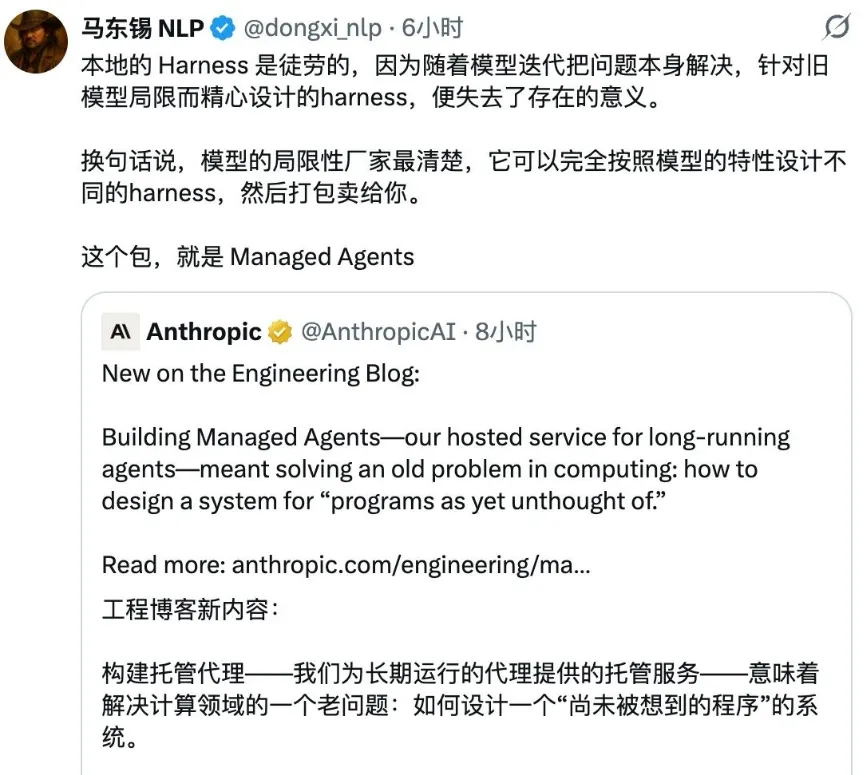 「本地的 Harness 是徒劳的,因为随着模型迭代把问题本身解决,针对旧模型局限而精心设计的 harness,便失去了存在的意义。换句话说,模型的局限性厂家最清楚,它可以完全按照模型的特性设计不同的 harness,然后打包卖给你。这个包,就是 Managed Agents。」