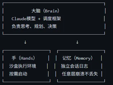 后来做了一个关键拆分。大脑是 Claude 和调度框架,负责思考和决策。手是沙盒和各种工具,负责执行。记忆是独立的会话日志,记录发生的一切。三者互不依赖,任何一个挂了都不影响另外两个。