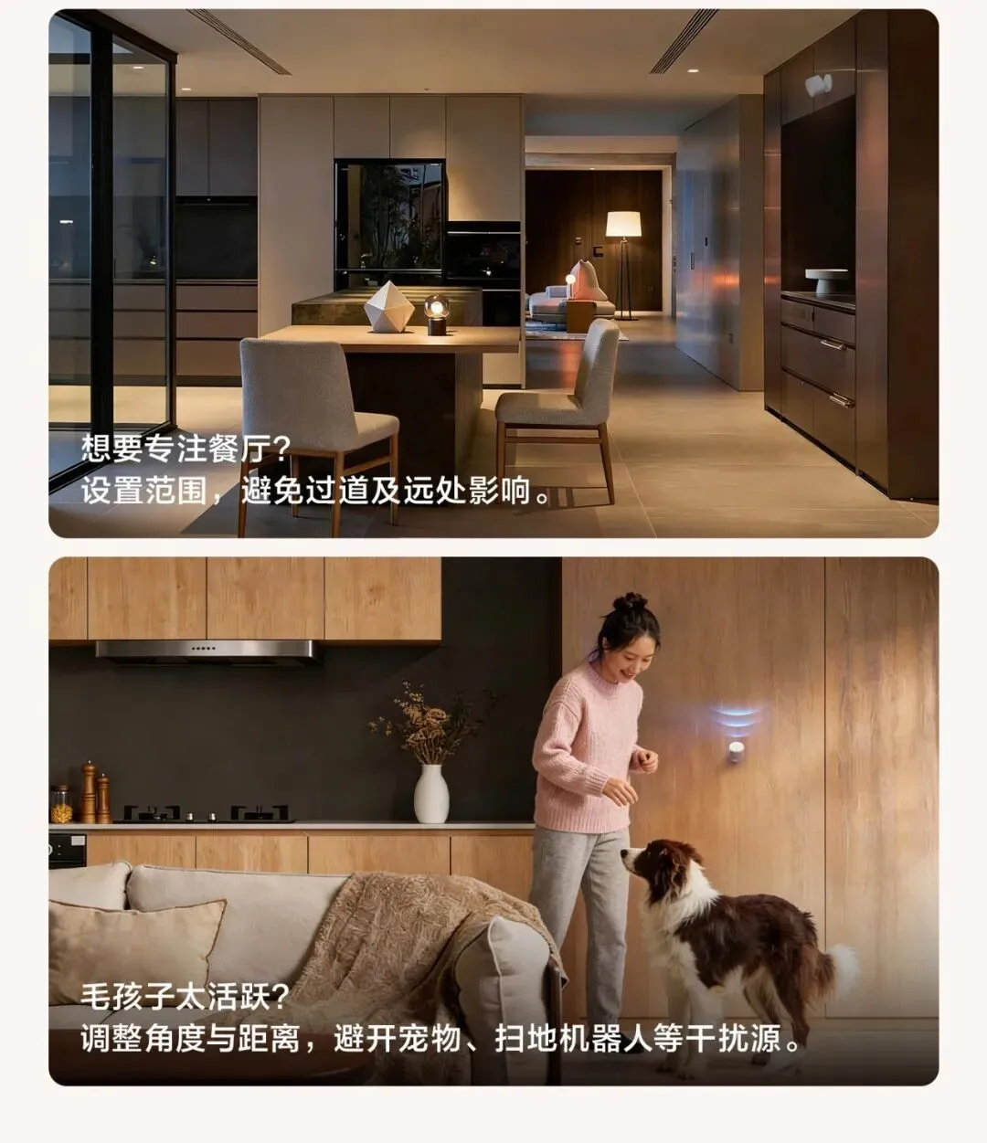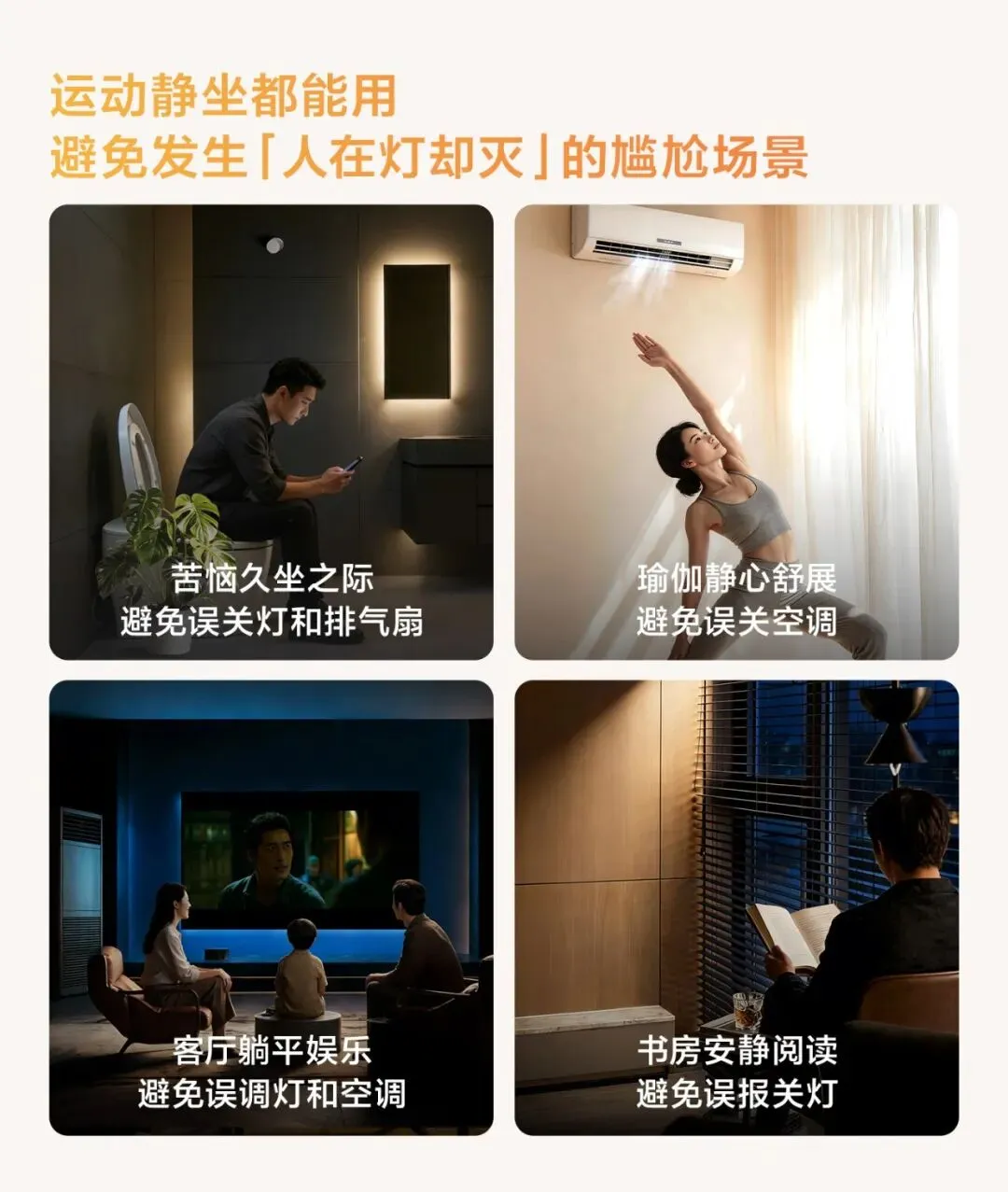 动静全捕捉:可精准识别人体动、静态存在,无论是书房久坐、客厅躺平观影、卧室静卧,还是瑜伽伸展、办公专注,均能被稳定感知,根治“人在灯灭、人走未关”的行业痛点。