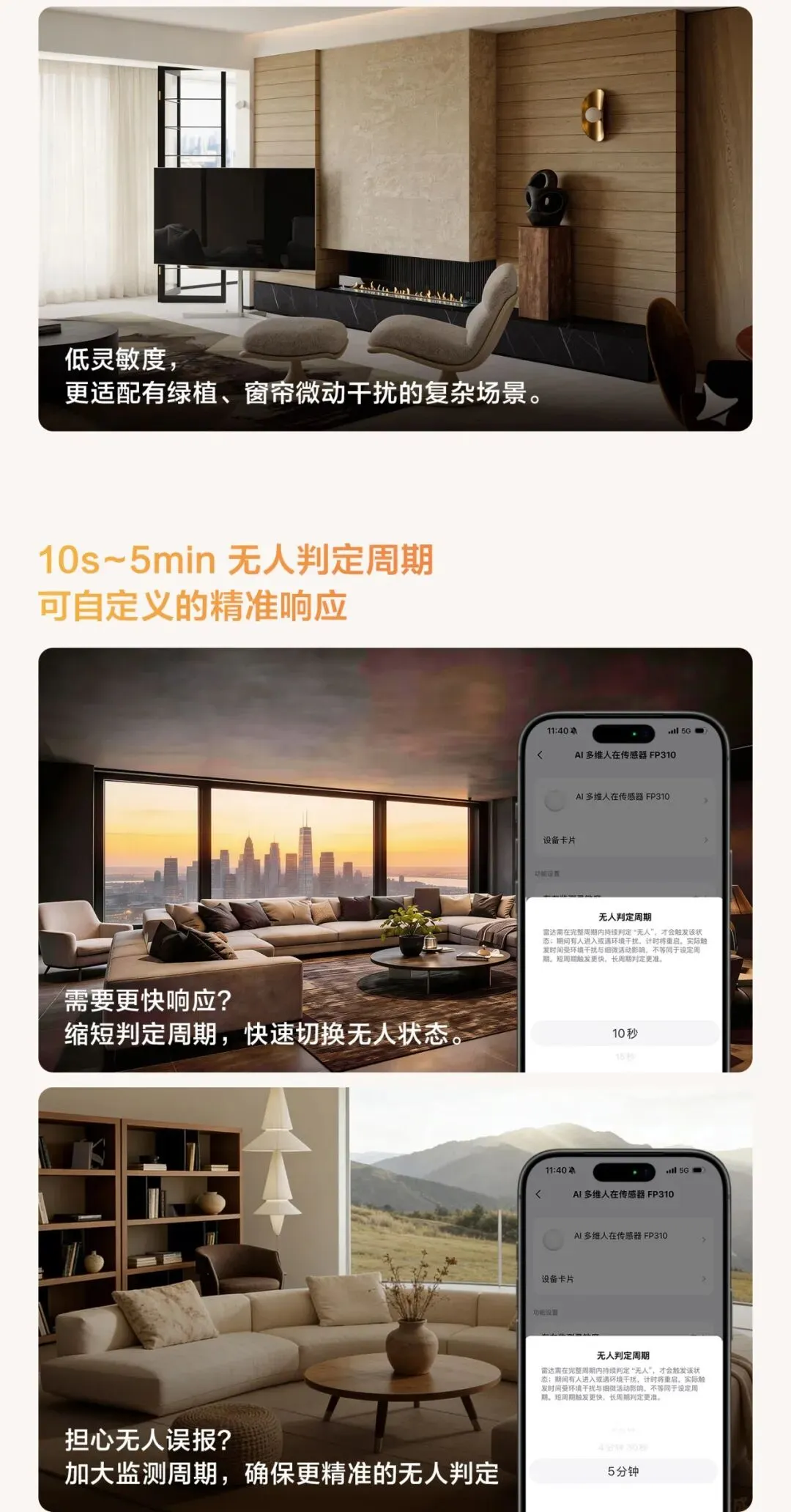从繁琐布线到即装即用,从单一存在检测到毫米波多维精准感知——Aqara FP310不仅是产品升级,更是对智能家居感知逻辑的重构。它以毫米波技术确保“人在不误判”,以免布线设计降低使用门槛,用AI让系统越用越聪明,最终实现“让空间懂你”的无感智能生活。不论新居旧宅,FP310都能助你轻松打造更懂生活的智能空间。