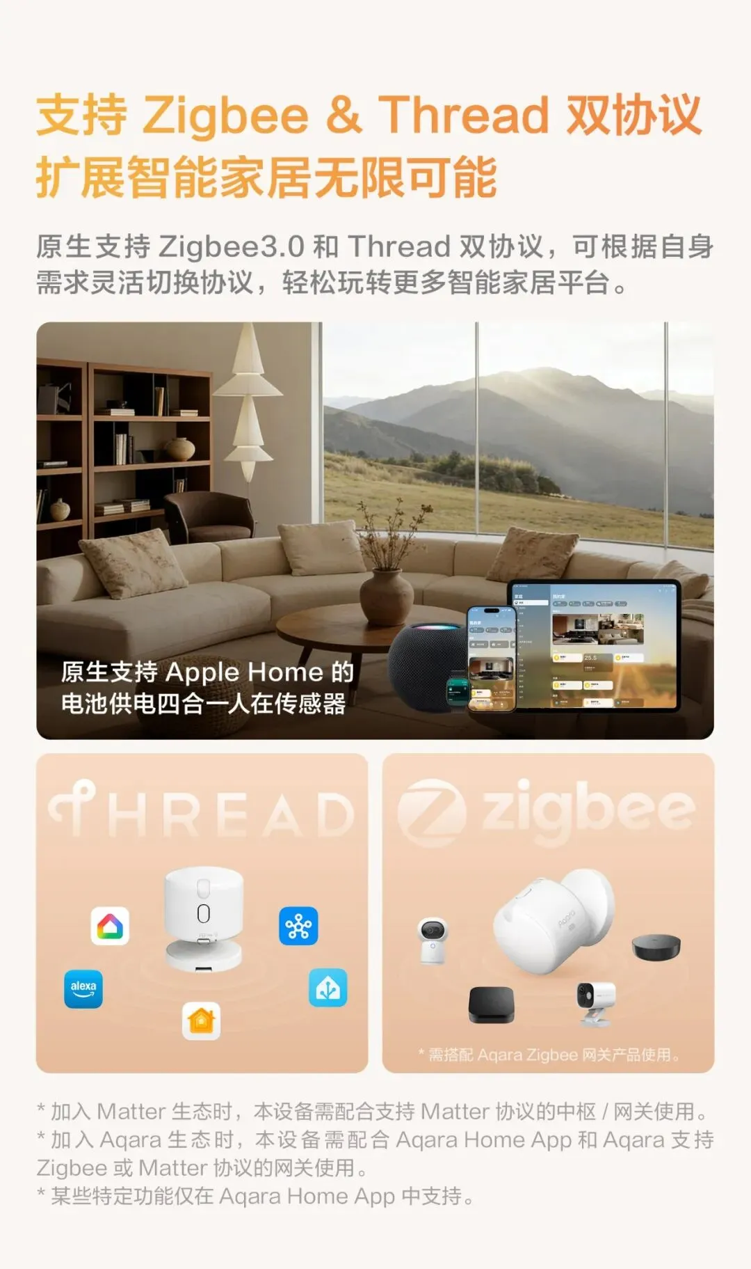原生支持Zigbee 3.0与Thread双协议,根据智能家居生态灵活切换;