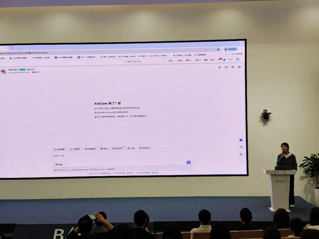在分享环节中,火山引擎高级解决方案架构师郝海莹介绍了公司推出的云端OpenClaw——ArkClaw产品。她表示,科技改变生活,欢迎大家使用火山引擎的ArkClaw,体验零门槛云端养龙虾。