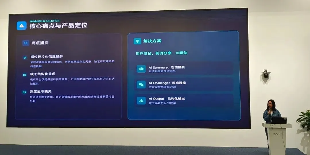 “求职者社区”团队聚焦刚需领域——求职,构思了一个AI驱动的求职互助平台。该平台的特色功能包括AI Summary、AI Challenge等,旨在借助AI的力量,帮助应届生更好地梳理求职思路。