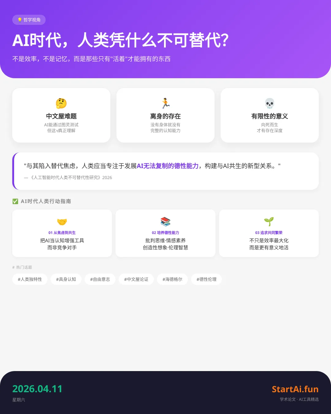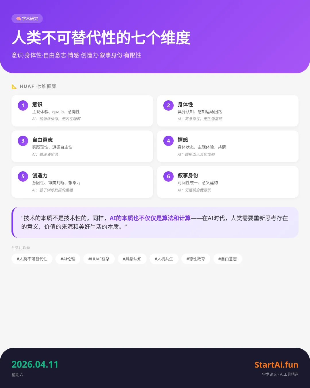 《人工智能时代人类不可替代性研究》。从哲学、认知科学、伦理学三个维度,系统论证了人类存在的七个核心特质,AI在根本上无法复制。