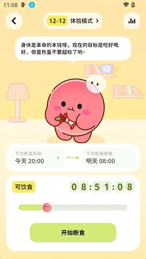 你看到的不只是卡路里,而是自己正在变好的痕迹。● 控制饮食 → 房间更舒适● 完成断食 → 解锁新家具● 状态稳定下来 → 环境持续优化