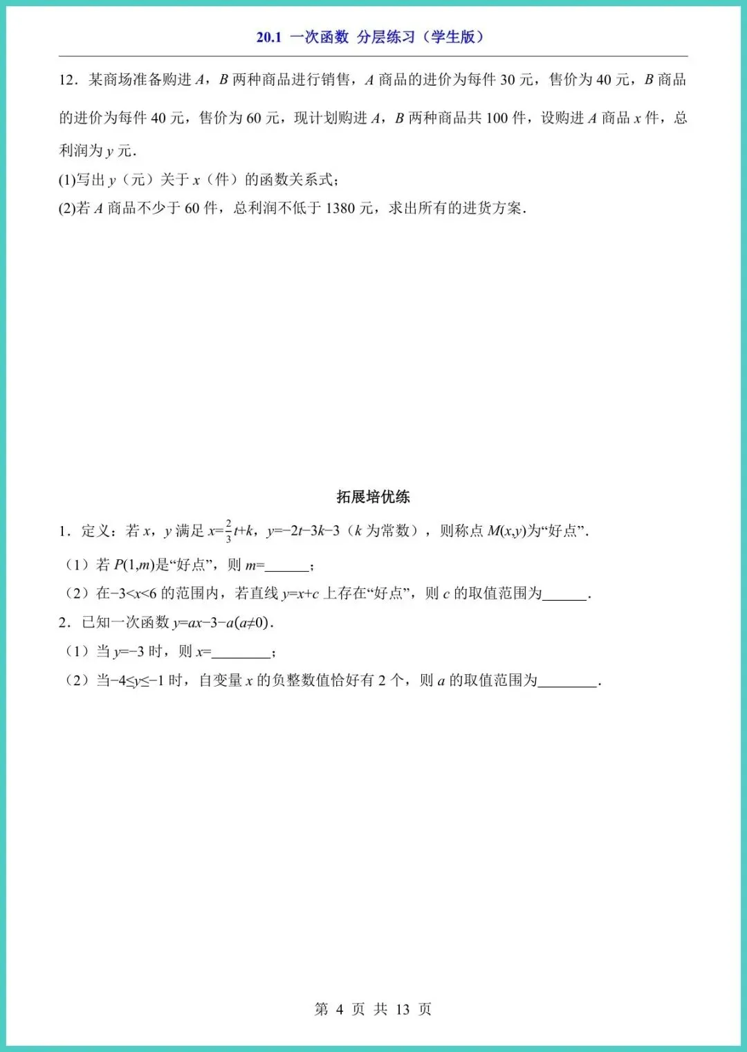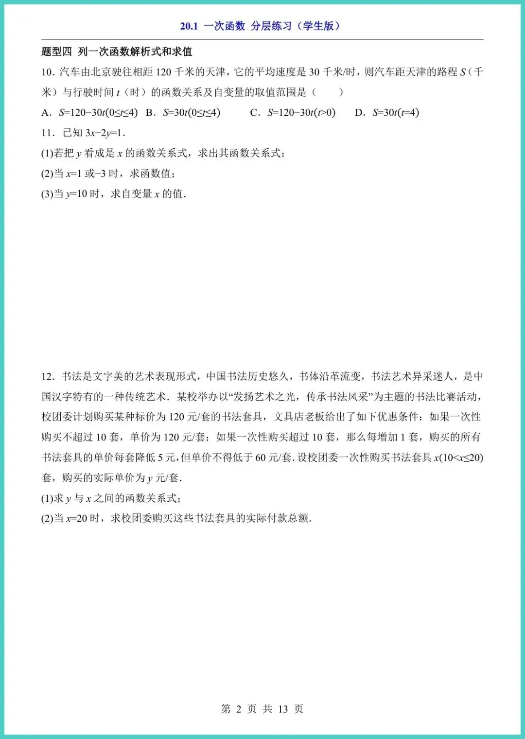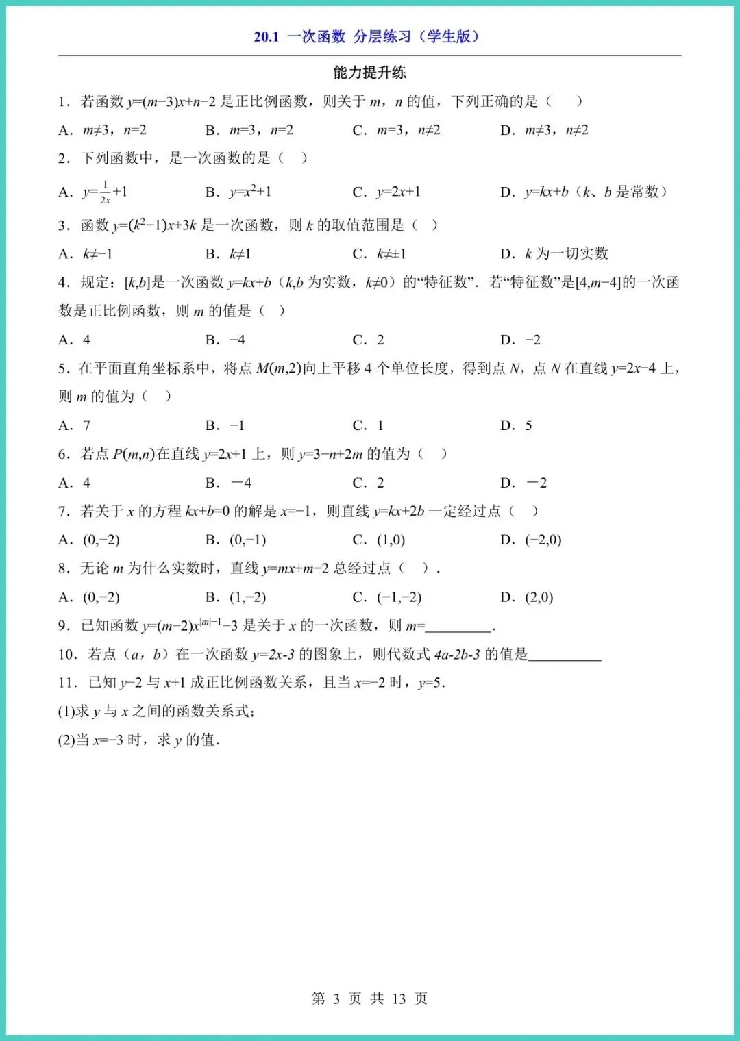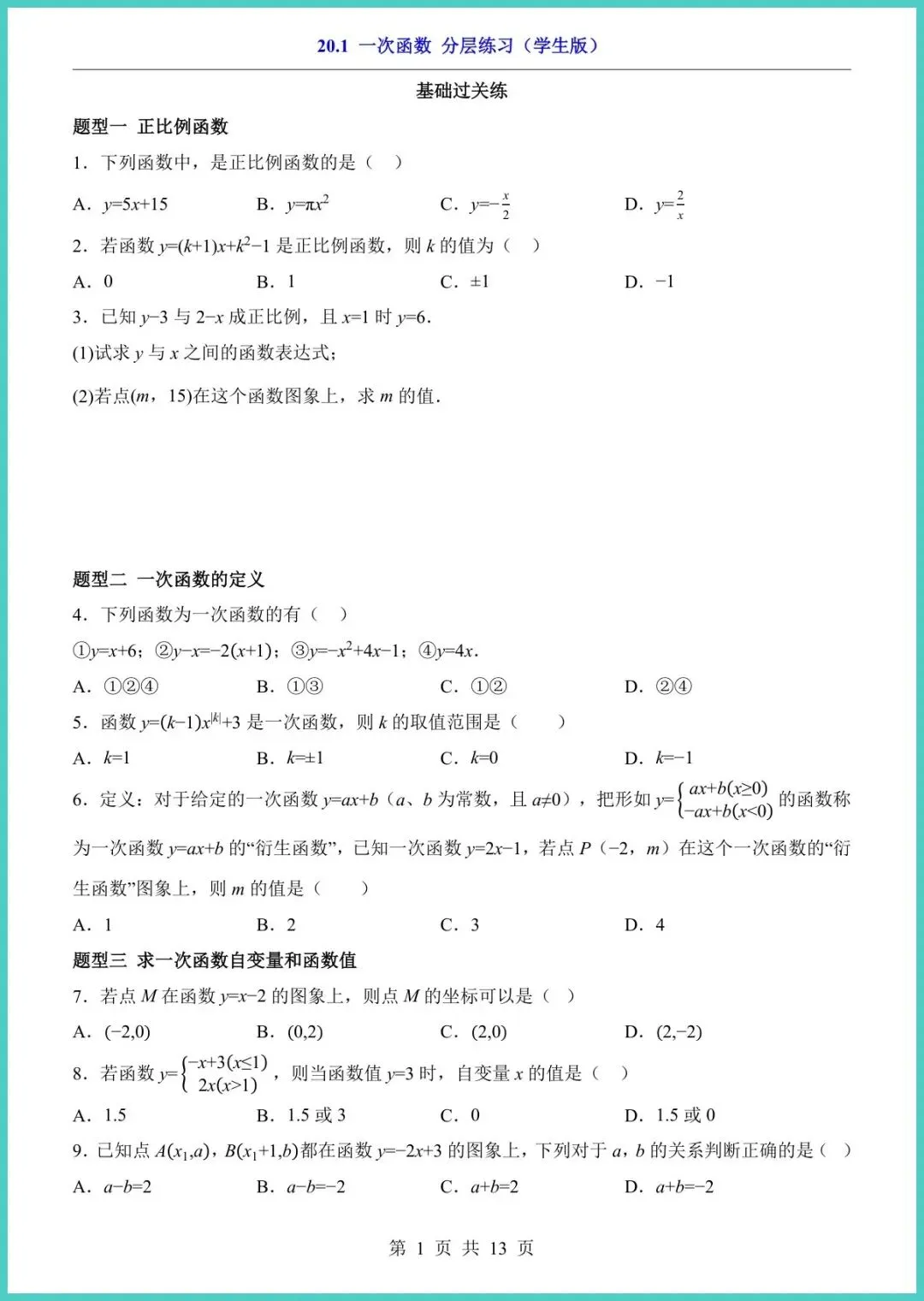 26年春冀教版八年级下册数学《一次函数》分层练习册,13页电子版,一键就能打印!资料把“一次函数”拆成基础、进阶、拓展三层:概念填空图象速判应用大题,孩子先稳地基再冲高峰,题型对标月考、期中考,做完立刻看见提分点。趁周末空档,家长快打印出来让孩子练一练,抢先一步赢在下一场考试!