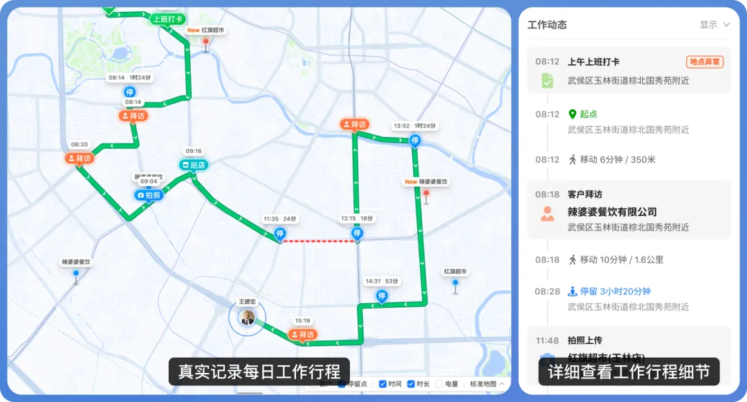 停留点位及时长:在各客户处的到访位置、停留时间,反映拜访的真实发生
