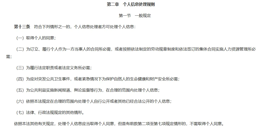 2021年正式施行的《个人信息保护法》第十三条规定,处理个人信息须符合"为订立、履行个人作为一方当事人的合同所必要"或"为履行法定职责或者法定义务所必要"等条件。