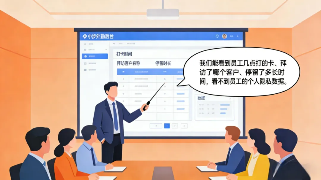 "大家看,这是管理后台。我们能看到的信息就是这些:你今天几点打的卡、拜访了哪个客户、停留了多长时间,看不到你的个人隐私数据。"