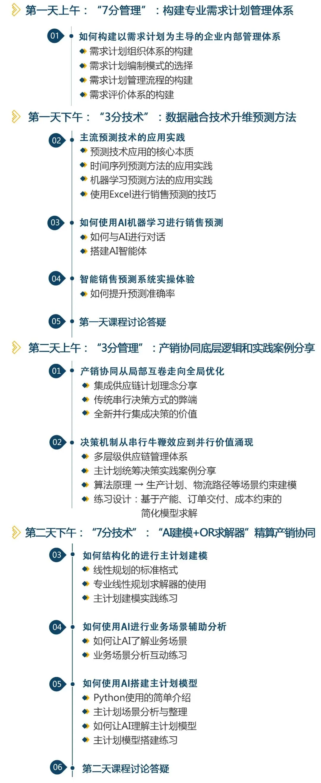 以DeepSeek为代表的Al认知智能+算力加持下的OR数学智能,正在消弭技术与业务之间的鸿沟。AI不仅升级了预测技术,推动需求计划管理的升维。AI同时降低了建模门槛(自然语言一优化模型转化),并与OR运筹算法的深度融合,进而催生了全新的决策模式,为制造业突破产销决策困境提供了全新解决方案。通过本次培训,一堂课解锁AI+OR双引擎在供应链计划领域的实战应用,破局企业“三高”困境。