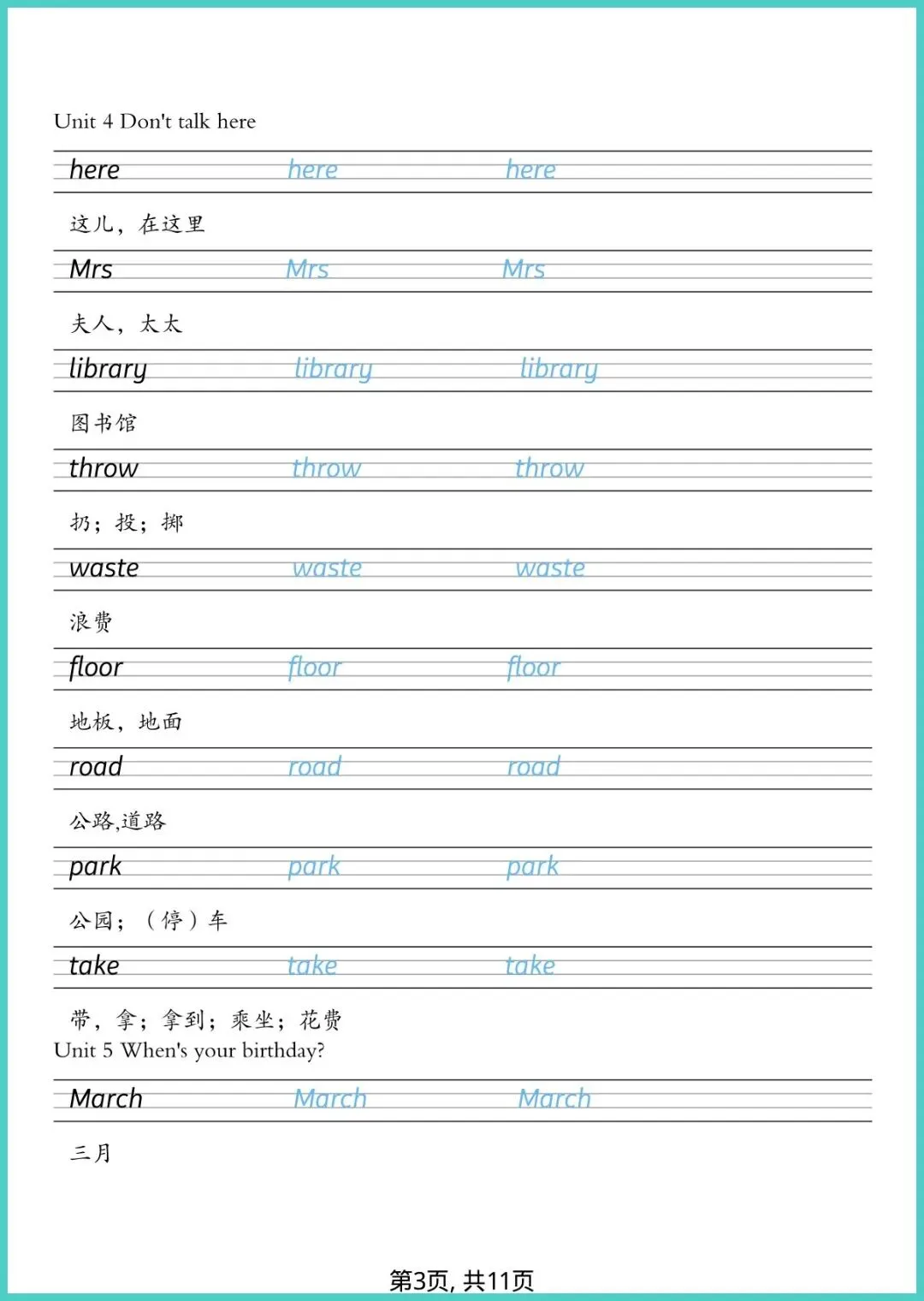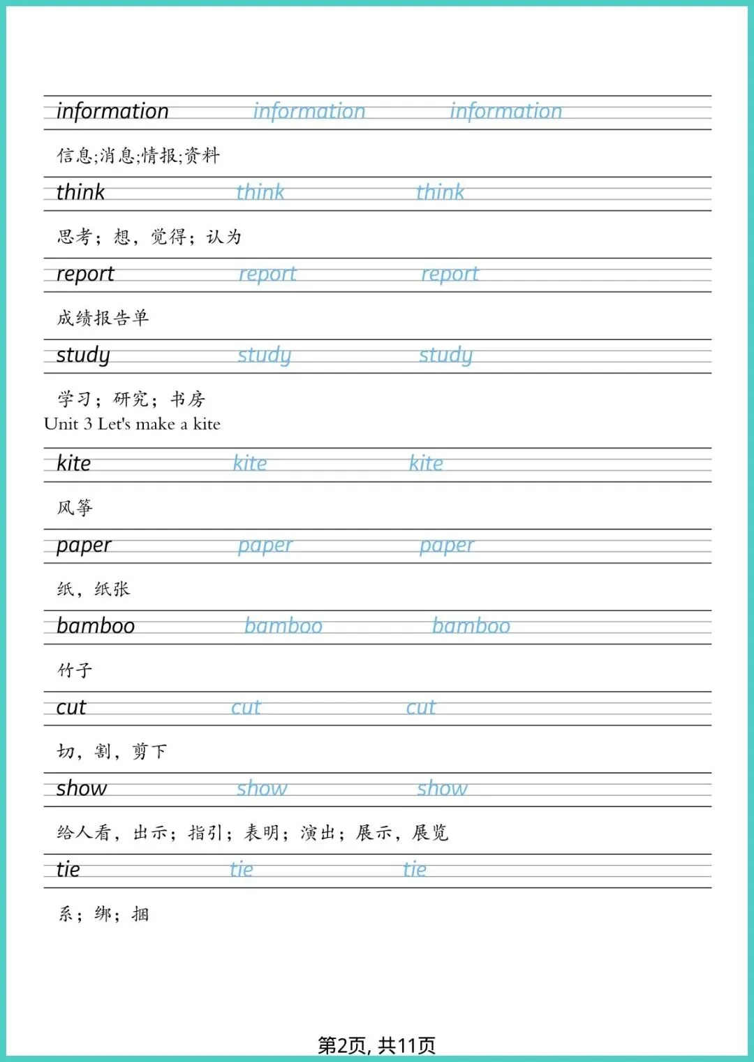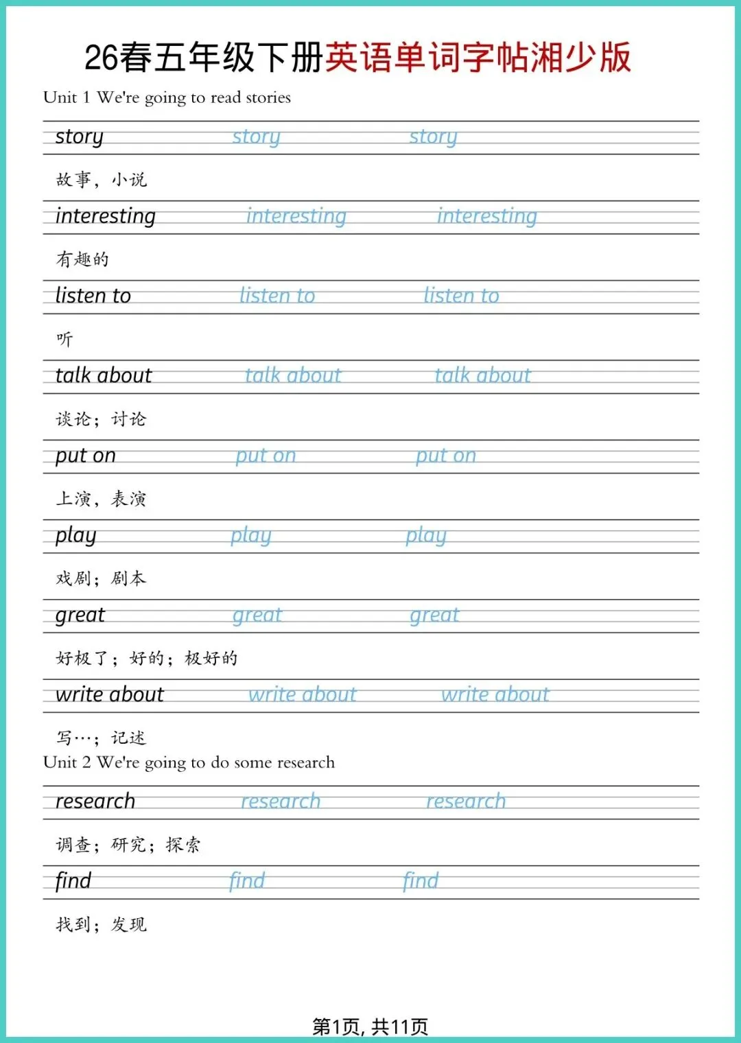 26春湘少版五年级下册英语单词字帖新鲜出炉,薄薄11页却字字精华!收录教材全部重点词汇,配标准手写体四线三格描红,从字母到短语再到句子,循序练笔、同步记义,边写边背,字形更漂亮,记忆更牢固。每天10分钟,轻松解决“单词总写错、卷面被扣分”老大难,让孩子写得出、记得住、考得好!想给娃英语加分?现在就打印,练起来!