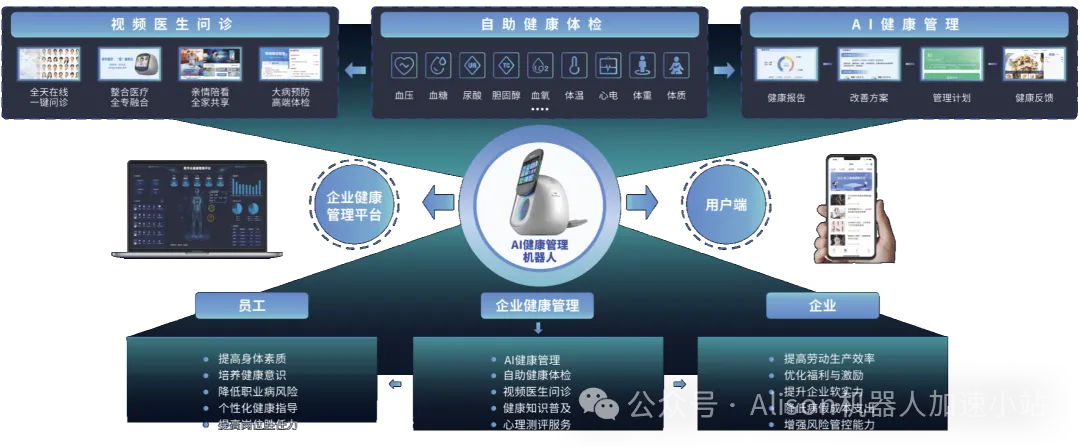 企业健康管理,可应用于办公室、工厂、员工休息室、宿舍等场景。以智能检测软硬件设备为入口,综合利用大数据及人工智能、互联网等技术,结合不同职工的服务需求,打造不同功能和特色的定制化内容健康指导中心,为职工提供AI健康管理、自助健康体检、视频医生问诊、健康知识普及、心理测评等服务。