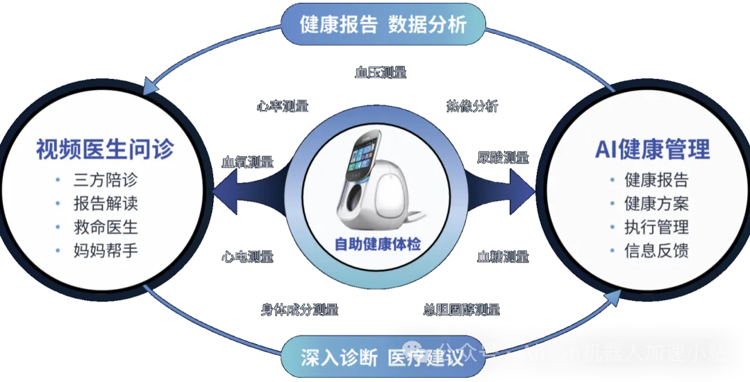 可以通过完成每日的健康检测,可便捷对血压、血糖、尿酸、总胆固醇、血氧、心电、体温、腰臀比的健康管理。所有检测设备均获得国家二类医疗器械认证,方便管理使用,并可通过云端医学模型,个性化生成健康报告,给出合理的饮食、运动等干预方案。它可以帮助及早识别病情隐患,实现慢病管理,大病预防的效果。