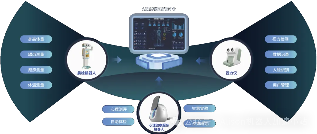 校园健康管理,可应用于幼儿园、照料中心、学校卫生室、心理咨询室等场景。智慧健康校园整体解决方案通过晨检机器人、视力仪、心理服务机器人+大数据系统等模块,覆盖日常健康监测、视力筛查和心理健康筛查等方面,可实现幼儿园晨检、中小学体检的智能化和信息化管理。
