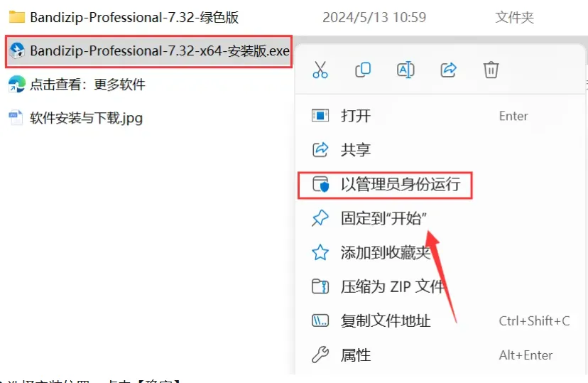 步骤 1: 鼠标右键点击下载好的【Bandizip-Professional-7.32-x64 - 安装版】文件,选择 【以管理员身份运行】。