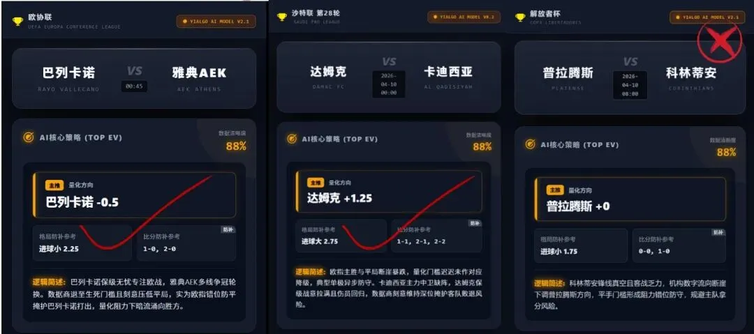 【回顾内容】昨天Yi-Algo量化了3场斩获2红成绩。达姆克一役表现最佳,Yi-Algo AI量化分析模型精准识破单极异步诱导,不仅主推方向稳稳红单,更完美卡位命中1-1防补比分,斩获双项红。巴列卡诺亦顺应量化阻力顺利打出主方向。只有普拉腾斯遭遇机构极端数据诱导且客队在锋线受损下打出超预期防反,后续 Yi-Algo AI 将针对南美杯赛的异常洗盘特征,进一步优化并下调相关因子降权权重。