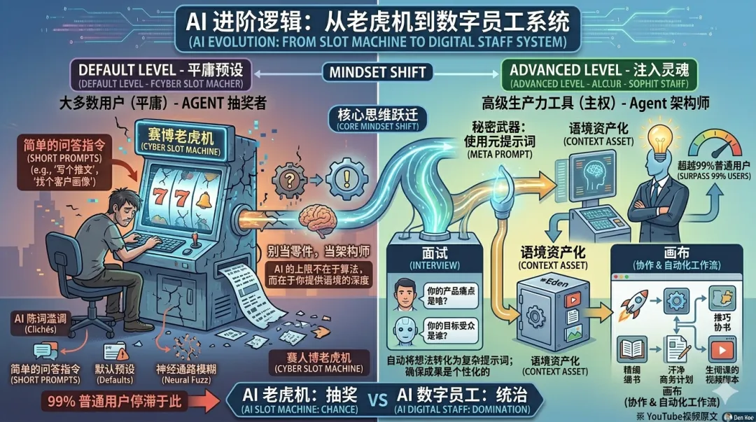 Dan Koe 一针见血地指出:AI 默认输出的是“人类平庸经验的平均值”。 如果你想获得超越 99% 人的卓越成果,你必须改变底层思维——从“简单问答”转向“系统编程”,将 AI 视为一名需要深度培训的数字员工。
