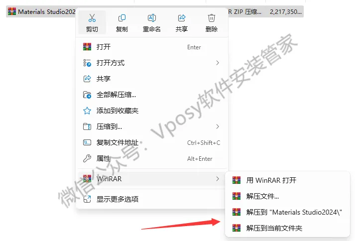1.解压安装包:鼠标右击【Materials Studio 2024】压缩包,选择电脑上安装的解压软件(如:WinRAR),点击【解压到Materials Studio 2024】。