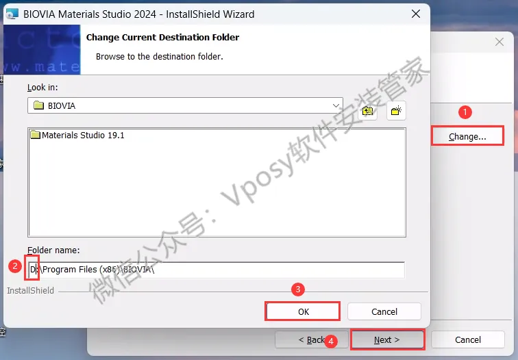 6.修改安装位置:①点击【Change】②修改路径地址中的第一个字符C可更改安装位置(如:把C改为D软件将安装到D盘)③点击【OK】④点击【Next】。