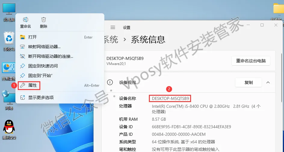 12.右键【此电脑】,点击【属性】,然后复制【设备名称】。
