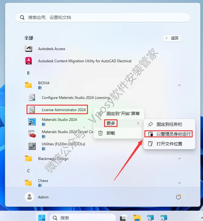 17.点击任务栏的【开始菜单】,在【所有应用】中找到【License Administrator 2024】,选择【更多】-【以管理员身份运行】。