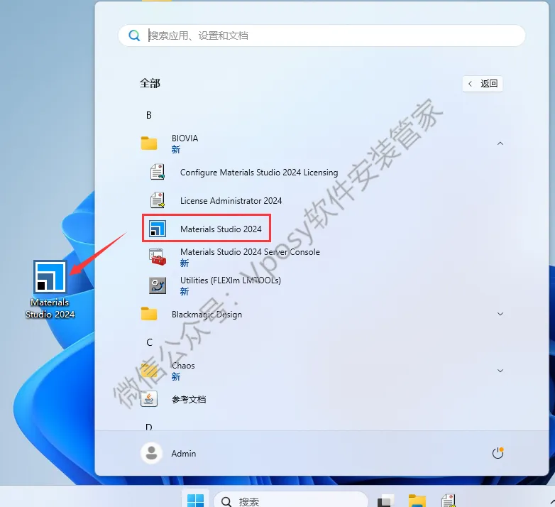 23.创建桌面快捷方式:①点击桌面任务栏中的【开始图标】>点击【所有应用】②将【Materials Studio 2024】图标拖到电脑桌面。