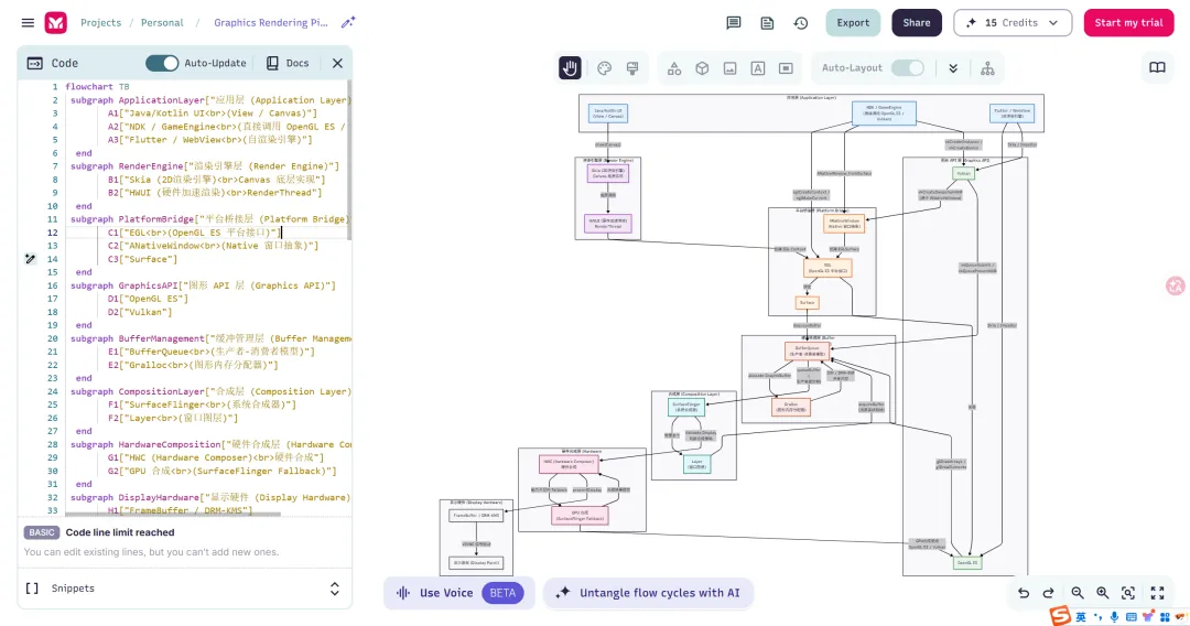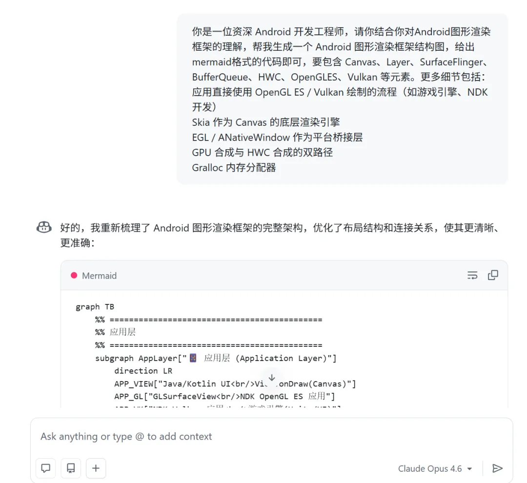 今天给大家分享一个使用 AI 高效绘制软件框架图、原理图的技巧。起因是知识星球小伙伴说,使用 AI 绘制流程图时会出现中文乱码、流程错乱的情况,咨询有什么好的技巧。考虑到目前绝大部分文生图的 AI 都没法做到一键交付,好用的 AI 非常贵,便宜的还处于初级水平。换一种思路,我们其实可以利用成熟的 AI 编程工具,通过直接生成基于文本的图表与流程图描述语言(DSL),用简洁的语法把文字转换为可视化图形(流程图、时序图、甘特图、类图、状态图、实体关系图等)。我常用的图形表述语言(DSL)是 Mermaid :https://github.com/mermaid-js/mermaid-live-editorMermaid 是一种基于文本的声明式语言(DSL),用于动态生成图表和流程图。你可以像写代码一样用纯文本描述图表结构,然后由工具自动渲染成可视化图形。我主要是喜欢 Mermaid 图表的风格,主题多样,简洁优美,它是基于 JavaScript ,可在浏览器中渲染,也可在 markdown 文件中像插入代码块一样插入图表,使用门槛极低。下面使用一个简单的例子说明基于 AI + Mermaid 生成图表的过程。将生成的 Mermaid 代码直接贴到左侧的代码栏,右侧将直接渲染出框架图,可以实时修改布局、主题、文本、字体等。你如果还有其他高效的绘图技巧,欢迎评论区分享,一起交流学习。