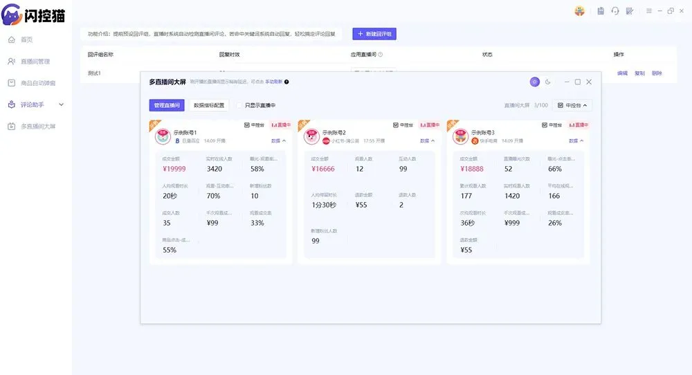 第二层,解放“眼”,实现全局可视化监控。手解放了,接下来就要解决“看不过来”的问题。当你同时运营多个直播间,尤其是跨不同平台时,最大的痛苦是什么?是你要在N个手机、N个电脑浏览器标签页之间疯狂切换。看抖音的数据,得切到抖音的后台;看小红书的评论,得打开小红书的创作者中心;想对比一下视频号和淘宝直播的实时在线人数,对不起,你得自己拿个本子记下来。这种碎片化的信息获取方式,效率极低,而且极易出错。你可能会错过某个直播间突然飙升的流量,也可能忽略掉某个平台评论区里集中出现的产品负面反馈。这需要的,是一个“作战指挥大屏”。不是让你真的去搞一块巨屏,而是通过工具,把所有分散的信息源,整合到一个统一的界面里。还是拿闪控猫举例,它的中控台可以同时展示你管理的所有直播间的实时画面、评论区、以及核心数据指标。你可以自定义每个平台要看哪几个关键数据,比如抖音看实时在线、成交金额、评论率;小红书看点击率、粉丝团新增。这样一来,你就像机场的塔台调度员,坐在一个屏幕前,就能看清所有跑道上飞机的状态,哪架该起飞,哪架该降落,一目了然。决策不再是基于盲猜和零碎信息,而是基于全局的、实时的数据面板。