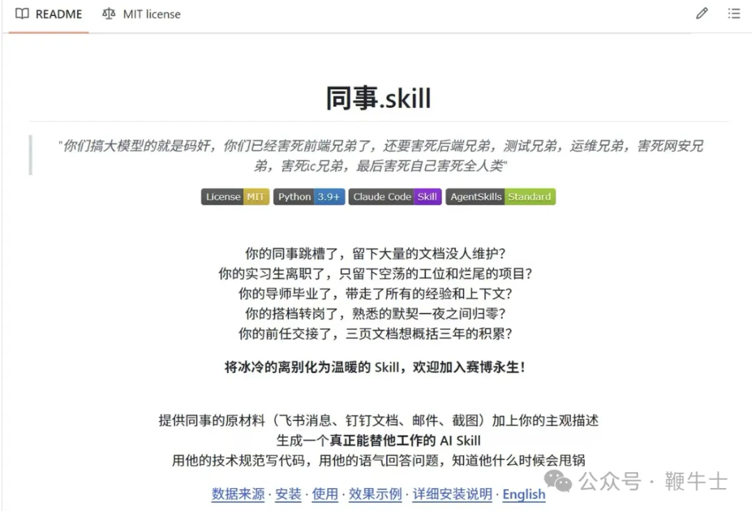 据了解,有网友分享GitHub上有一个名为“colleague-skill”的开源项目,该项目可以实现同事“赛博永生”。把员工的工作数据、文档、聊天记录等训练成AI,即便员工离职,仍能用AI继续承担部分工作。