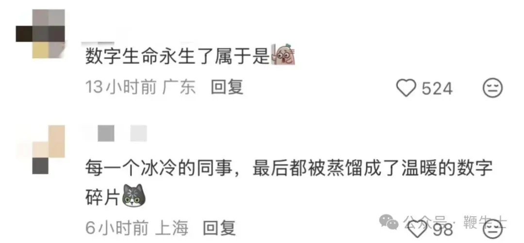 看到这波操作,不少网友表示,“数字生命永生了属于是”、“每一个冰冷的同事,最后都被蒸馏成了温暖的数字碎片。”