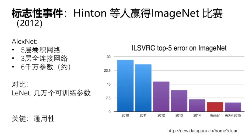 大数据最典型的例子就是深度学习。2012年,杰弗里·辛顿(Geoffrey Hinton)带领的团队凭借AlexNet赢得ImageNet竞赛,将错误率大幅降低了十几个百分点,这是深度学习崛起的标志性事件。尽管多层神经网络等算法早已存在,但只有在海量的高质量数据(例如 ImageNet)与算力资源(GPU)的共同支撑下,它的潜力才完全发挥出来。