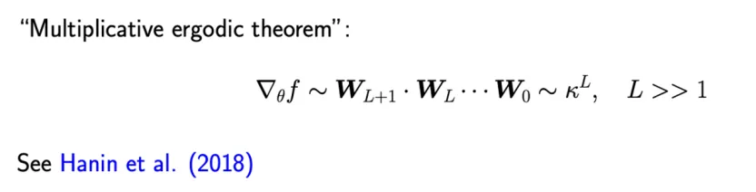 训练神经网络通常使用各种梯度下降的方法,所以避不开计算梯度,而梯度涉及到所有参数矩阵的连乘。由于神经网络在训练时一般是随机赋予初值,数学中著名的乘法遍历定理(multiplicative ergodic theorem)告诉我们,多个随机矩阵乘积得到的矩阵随着个数的增加会呈指数变化,这个指数的基数是一个被称之为李雅普诺夫指数的数字,通常记为κ。如果李雅普诺夫指数κ大于1,那么随着深度的增加,梯度是指数爆炸的;如果κ小于1,那么梯度是指数衰减的。两种情况都不是好结果。