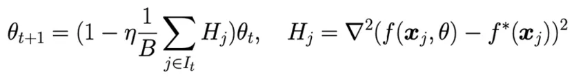 动力系统中有一个非常基本的概念:动力系统的收敛解必须是线性稳定的。从动力系统稳定性的角度出发,我们可以分析随机梯度下降的的线性稳定性。我们从一个简单的一维问题出发。下方表达式是线性化之后的随机梯度下降的迭代公式,其中Hj是第j个数据的海塞矩阵(Hessian Matrix),η是学习率(Learning Rate),B是批次大小(Batch Size)。集合中批次的选取是随机的,所以这是一个随机动力系统。