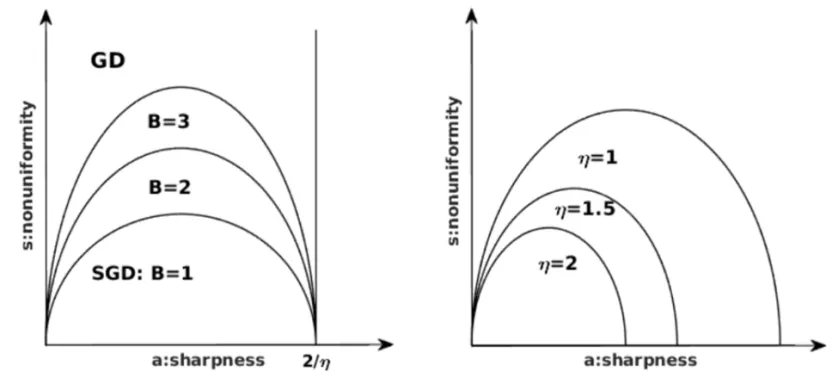 在尖锐度和不均匀度组成的空间中,分别固定学习率(下图左)和批次大小(下图右),画出稳定性区域,会发现稳定性随学习率和批次大小发生变化,而且随机梯度下降的稳定性区域小于梯度下降的稳定性区域。