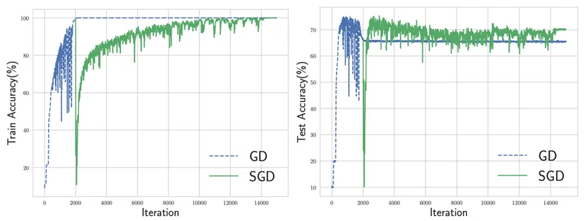 吴磊在实验中还发现了这样一个现象:当梯度下降的准确度接近100%时,如果突然把训练方法更换为随机梯度下降,那么训练的轨迹会快速逃逸原来的轨迹,然后再慢慢重新收敛,并收敛到另一个解。这个现象的原因就是梯度下降可以收敛到很多个解,但大多数这些解对于随机梯度下降都是不稳定的,后者只能在别的地方找到稳定的解。