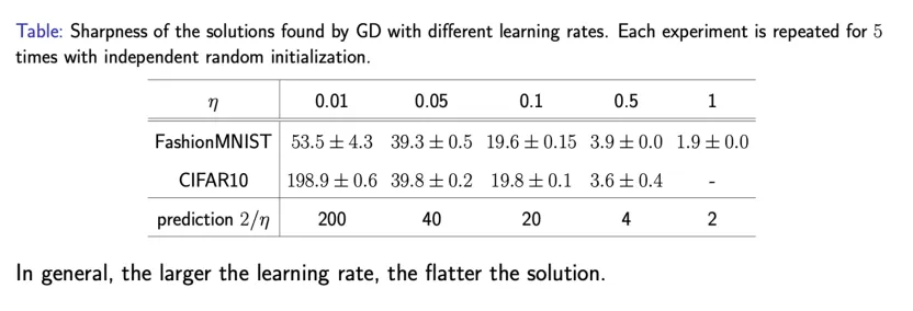 再看看实际计算中的情况。我们让梯度下降在两个数据集(Fashion-MNIST和CIFAR-10)上使用不同的学习率进行训练。梯度下降的稳定性要求表明,尖锐度必然小于2/η。从实验结果我们可以看出这个稳定性条件是满足的。更为重要的是,我们发现实验结果离稳定性的边界靠得很近,梯度下降方法的训练轨迹实际上是处在稳定区域的边缘(edge of stability)。随机梯度下降也有类似的现象。