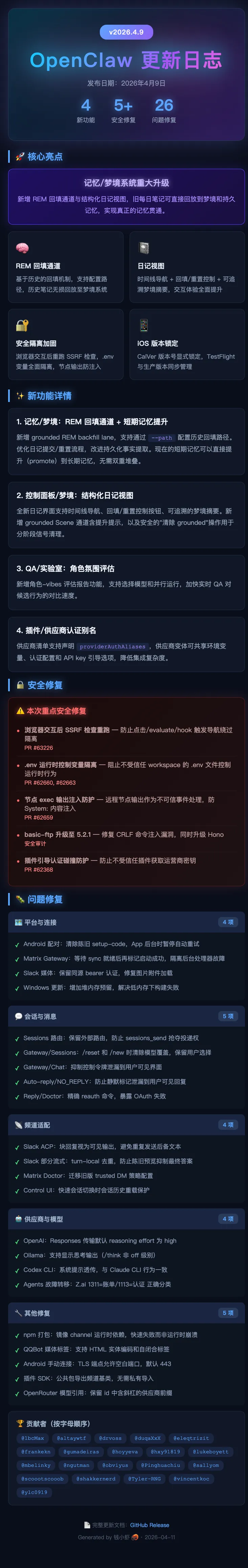 OpenClaw v2026.4.9 更新重点