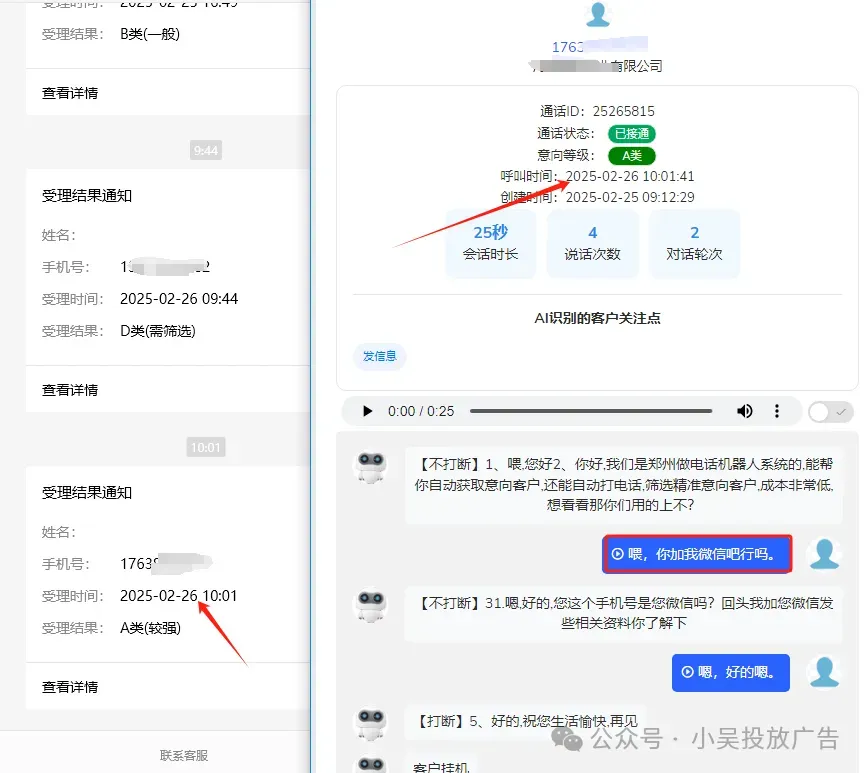 5. 意向客户自动分类拨打过程中会根据客户意向自动分为A/B/C/D类客户,再将意向客户主动推送到你的微信上,由业务人员精准跟进。