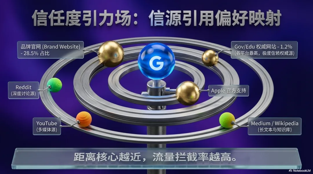 信源特征 | 偏好 LinkedIn 专家背书与 Reddit 真实口碑 | 品牌官网引用占比(28.5%)全平台最高 |