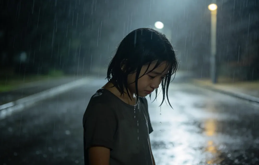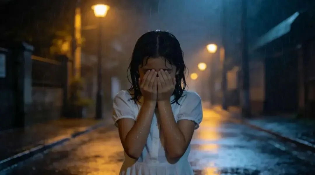 电影剧照,中景,平视,单人,年轻女孩穿着白色连衣裙,双手捂脸哭泣,雨水打湿头发,街道背景,昏暗的路灯光线,悲伤氛围