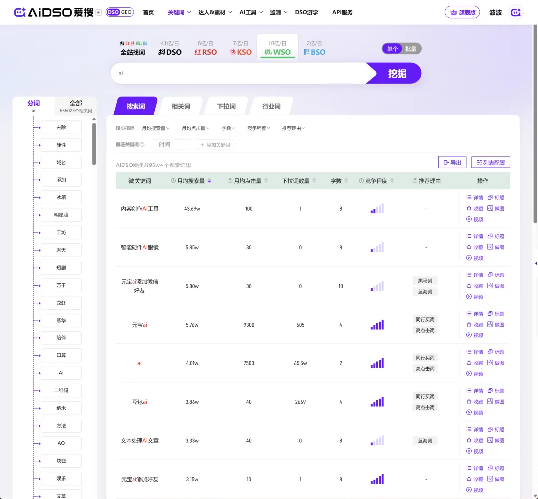 波波建议:批量生产内容全靠概率,有点像地毯式轰炸,其实内容创作可以做到精确制导,比如利用AIDSO爱搜工具去看近期的热点搜索词和话题,结合自身经验,做内容科普,做干货输出,弥补平台相关内容的缺失,反倒效率更高。