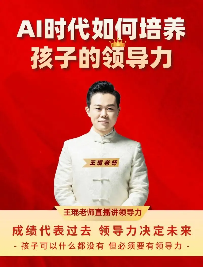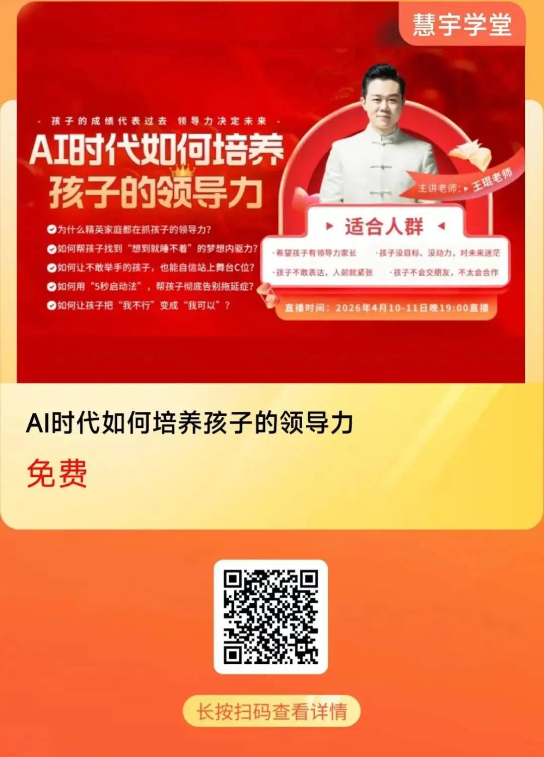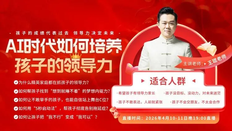 今晚19:00,王琨老师将继续带家长和孩子破解“领导力培养”的密码,让孩子在AI浪潮中,拥有不可替代的核心竞争力!